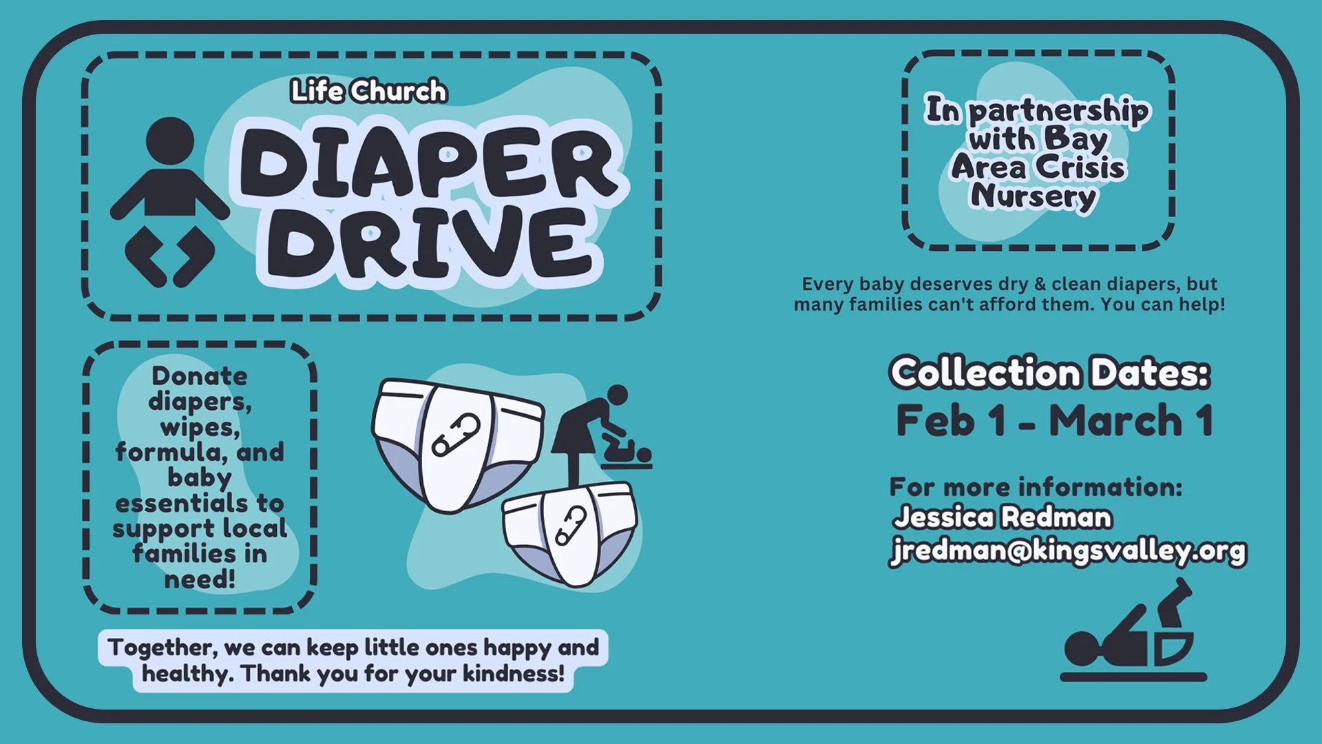 We’re partnering with the Bay Area Crisis Nursery to support local families in need through a Diaper Drive! We’ll be collecting diapers, wipes, formula, and baby essntials to bless families right here in our community.